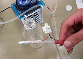 そこで、ストロー付きのポンプを考えました。ペットボトルから口まで電動ポンプで飲み物を運ぶ為、距離が離れていても肺活量は必要ありません。部屋の中ならばペットボトルを動かす必要がありません。更に、長時間の使用でも疲れる事もないです。寝転んで飲み物を飲む事も出来ます。